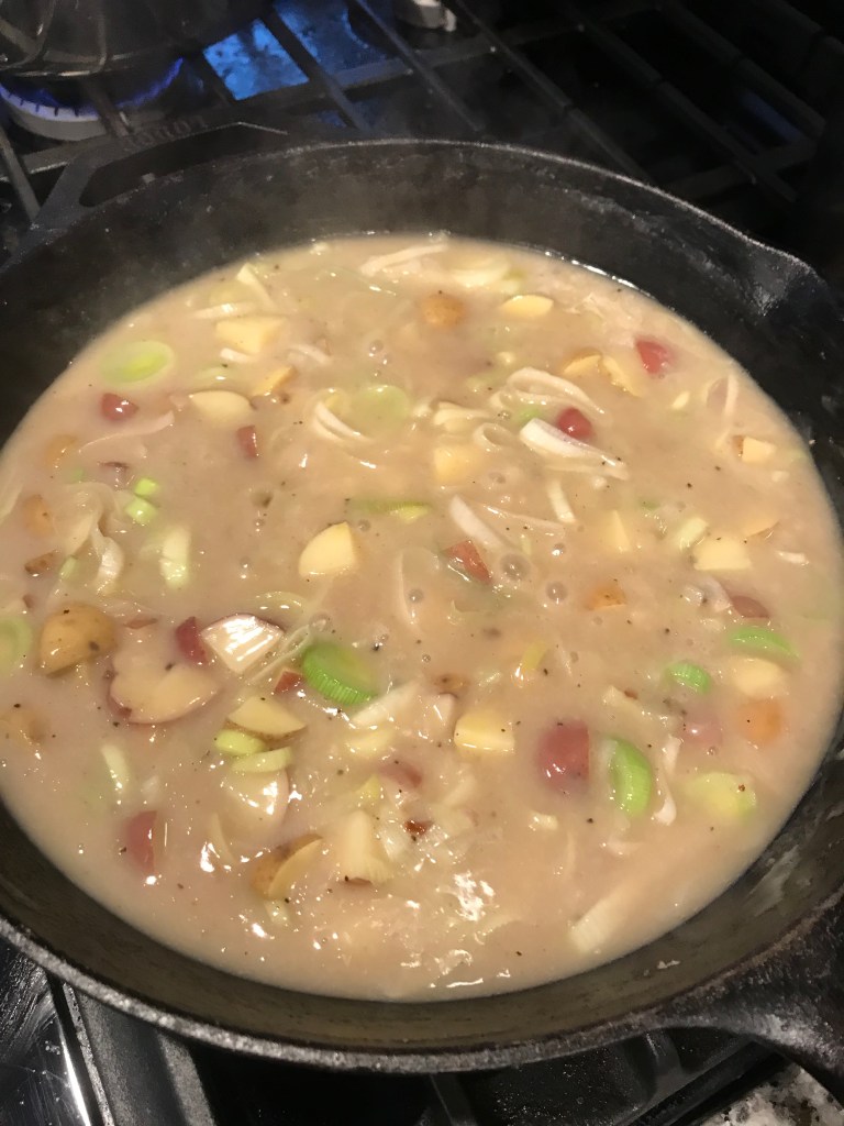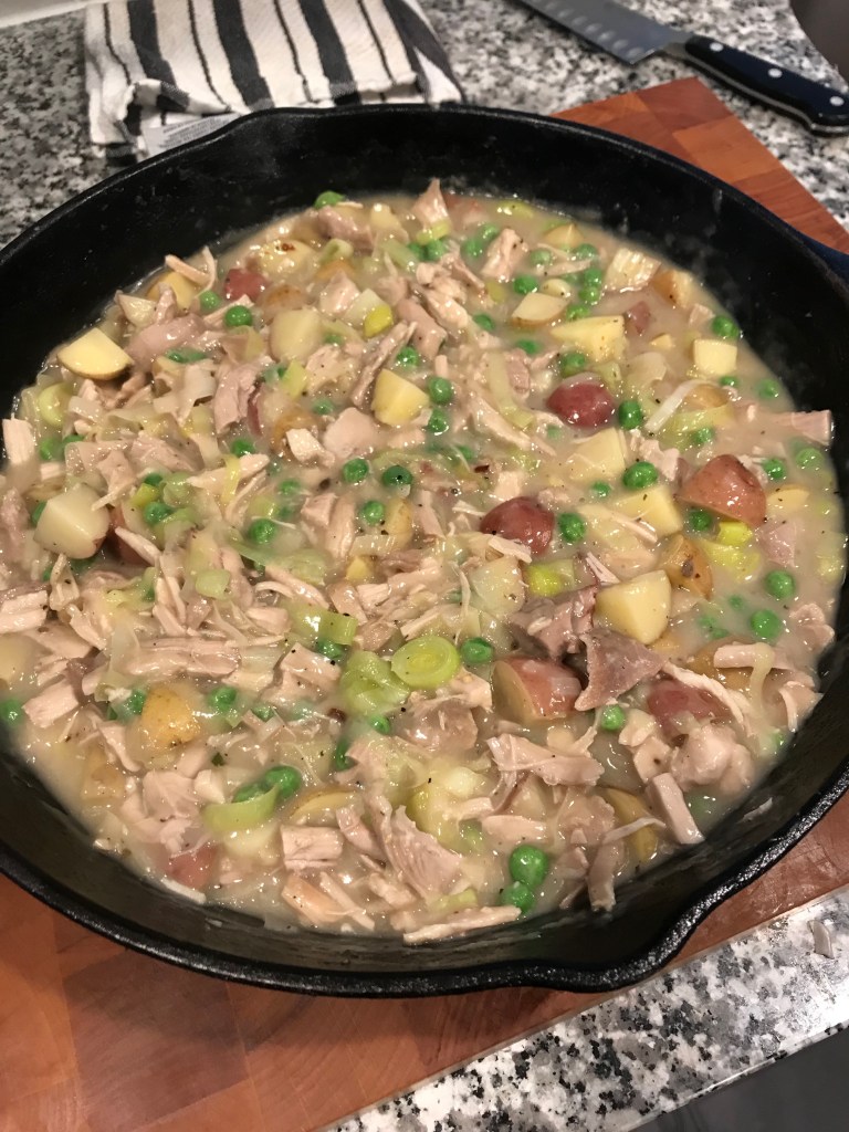 Start adding the chicken stock 1/4 cupful at a time and whisk the stock into the roux until smooth. Once all the stock is in the pan, bring to a boil, then reduce the heat and add the carrots, leek and potatoes. Simmer until the carrots and potatoes are just softened and the stock has reduced down by about half. Add the chicken, peas, herbs and salt/ pepper to taste. Stir to combine.