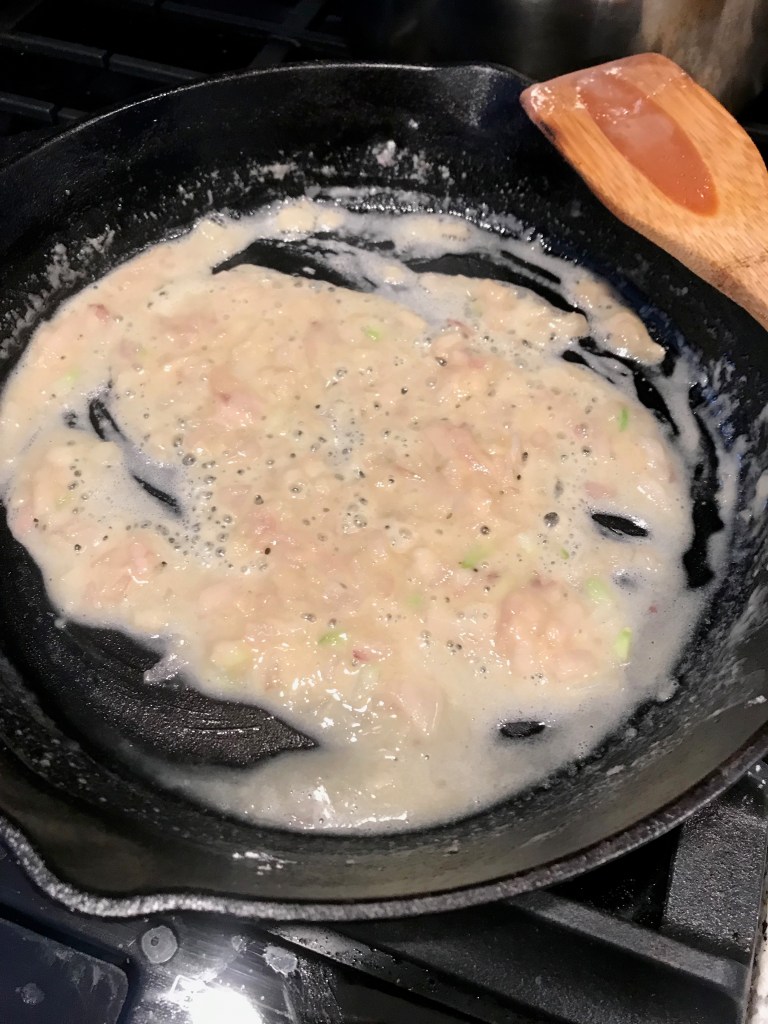 To this add the flour, 1 tablespoon at a time and whisk until fully incorporated. Let this mixture cook together, whisking regularly, for about 2 minutes. This process lets the raw flour taste cook out of the roux.
