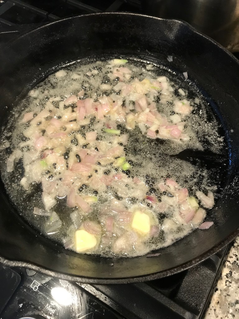 In a 10-inch cast iron skillet, melt butter and 1 tablespoon of olive oil over medium heat. Once the butter is melted completely, add the shallots and garlic to the pan and cook until just soft.