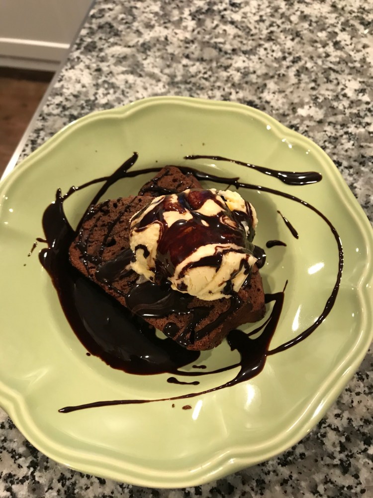 On the first night, we ate this for dessert with some ice cream and chocolate sauce. But since, I've consumed most of the rest for breakfast. Like now, as I write this, it is divine with a cup of coffee.