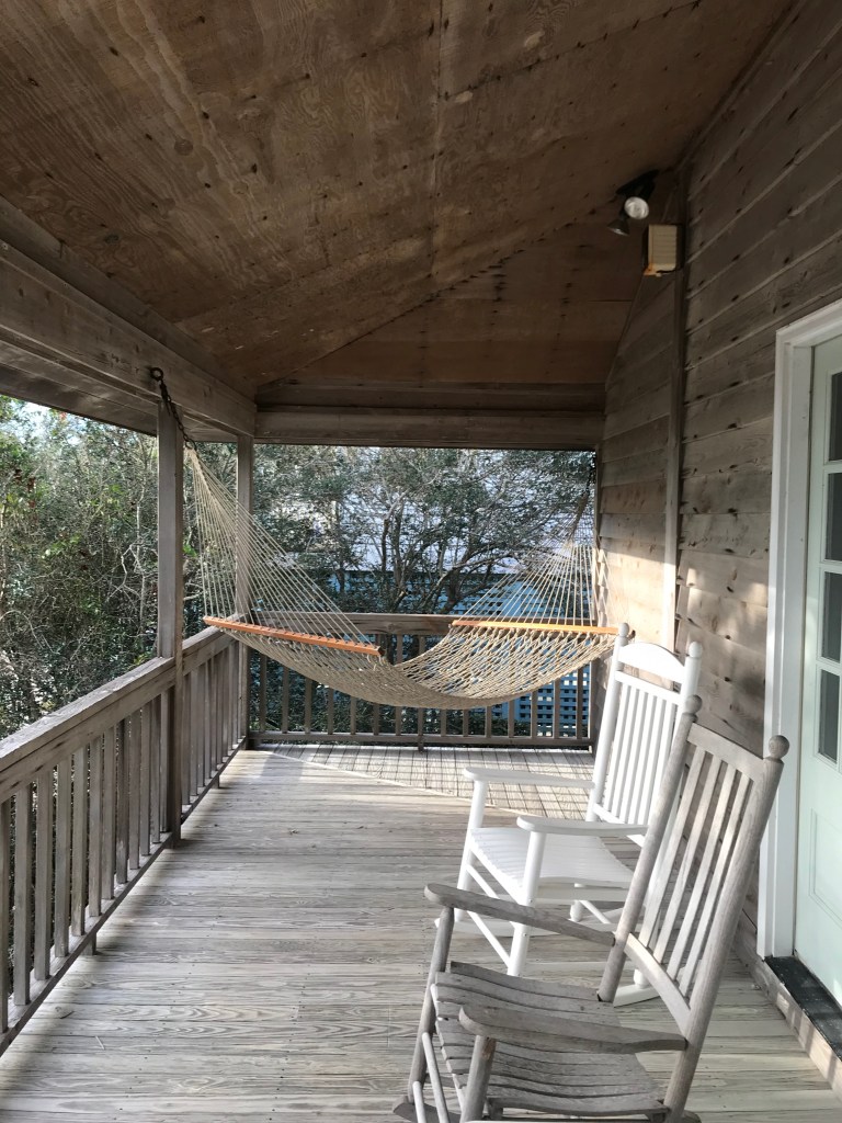 The front porch view is the beach and the ocean. There are rocking chairs, porch swing and a hammock. The breeze is coming off the ocean and it's just chilly enough for the hot soup to really feel like it's warming your soul.