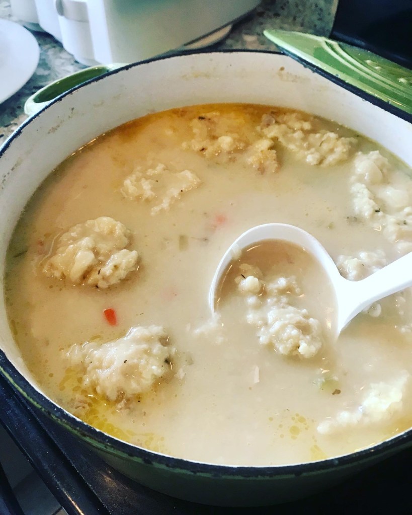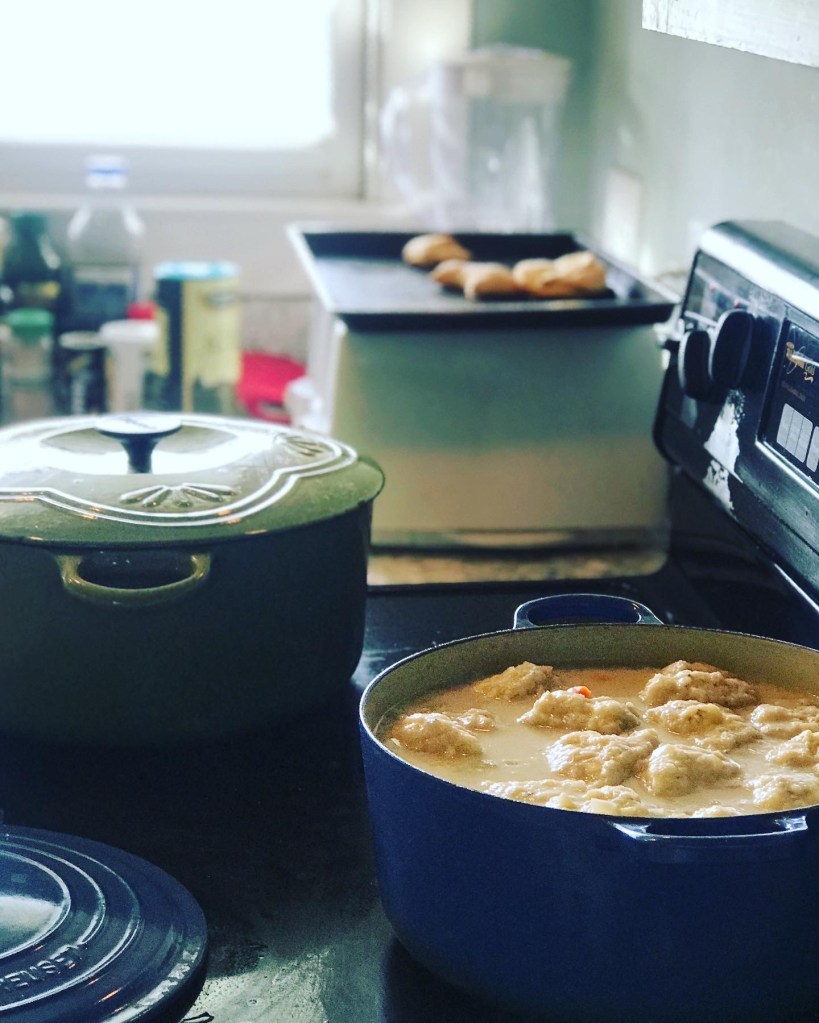 We spent a lot of time sitting around in our pajamas and letting the breeze blow through that house, while making massive amounts of coffee and eating my aunt's homemade cinnamon rolls. I was asked to take care of dinner one evening of the trip, which I was more than happy to do. I chose to make Chicken and Dumplings, because it's October and that's comfort food time. It also would be enough for a crowd and keep for leftovers the next day.