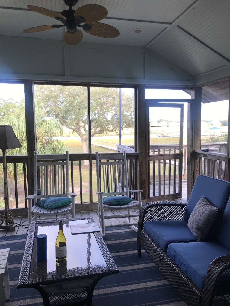 The back porch is screened in, but since all the doors are open the breeze is coming right through the house from the beach side. You can see the grasses blowing in the wind, while the egrets and your father fish in the marsh.