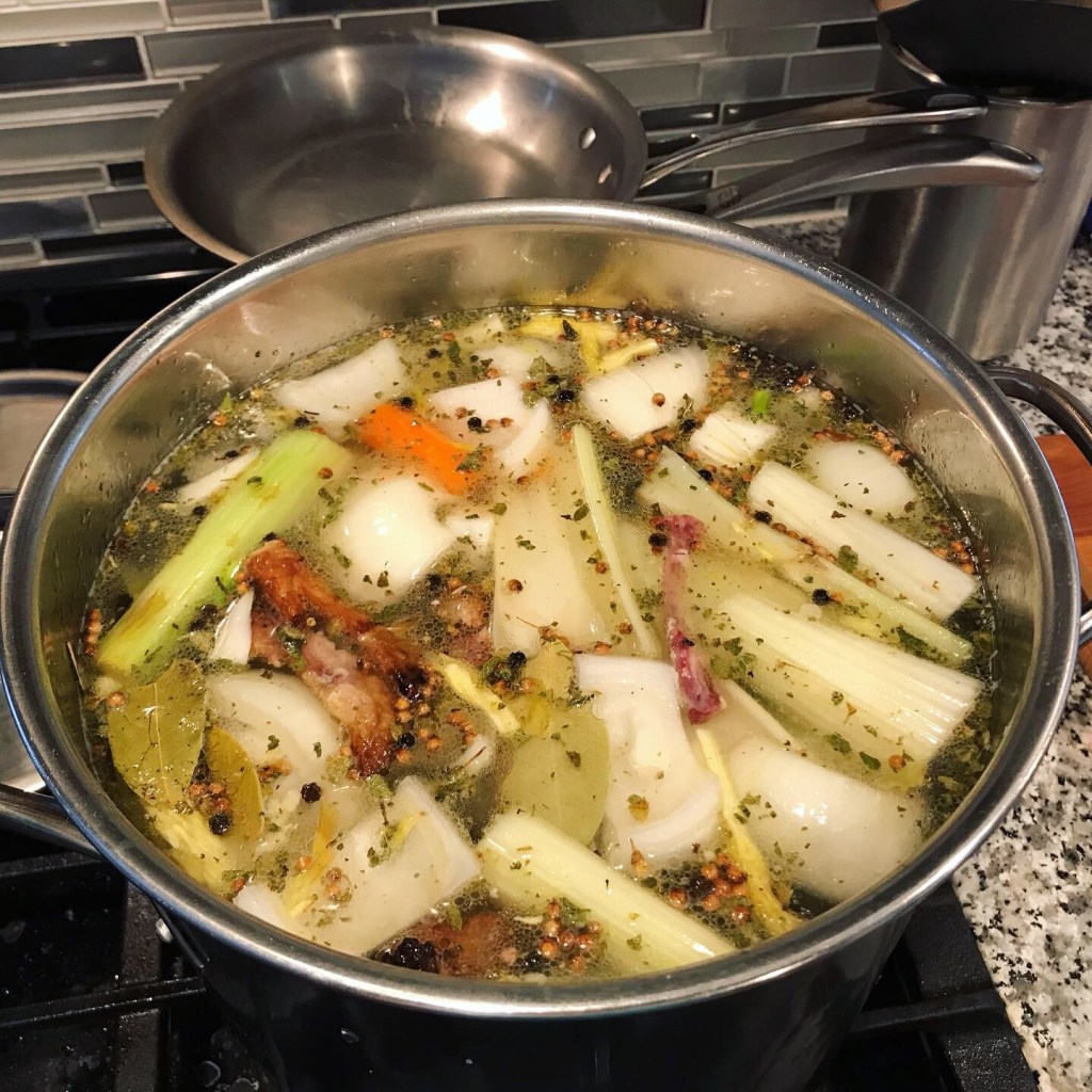 Once roasted, dump the sheet pan contents into your stock pot, scrape all the brown bits from the pan into the stock pot as well. Add all of the other ingredients up to the apple cider vinegar and then cover with water.