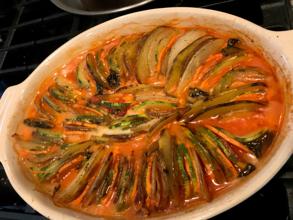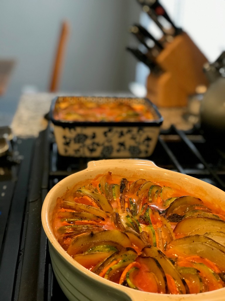 Make the tomato sauce first so it can simmer a bit while you slice the veggies. The béchamel should be made immediately before you start assembling the ratatouille.