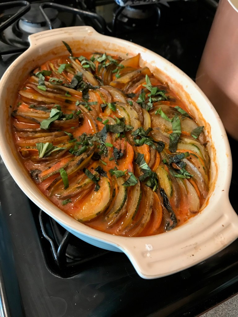 To serve, scoop the ratatouille onto a plate or wide bowl, spoon some of the sauce from the bottom of the dish around the outer edge of the veggies and top with more of the chiffonade of basil and shaved parmesan cheese.