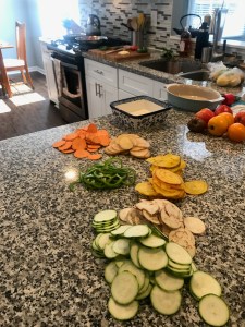 Using the mandolin, slice all the veggies (except the garlic) to about 1/4 inch thickness or thinner if you prefer. Slice the garlic thin using your favorite sharp knife.