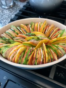 When you get to the end of each veggie piece, leave about an inch and slice the remainder with your knife, as close as possible to the size of the mandolin slices. These pieces won’t be as pretty, but just use them on the bottom of the dish and no one will ever know.