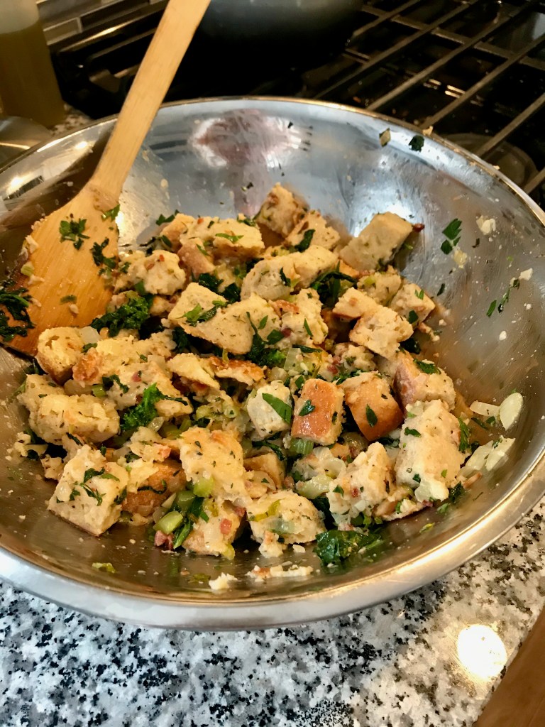 Add 4 tbsps of the butter to the saute pan along with the diced onions and celery. Add a pinch of salt and cook for 2 - 3 minutes, then add the garlic and cook until translucent, about 2 more minutes. Then add the fresh herbs and greens if using. Toss to coat then transfer the contents to the bowl with the bread.