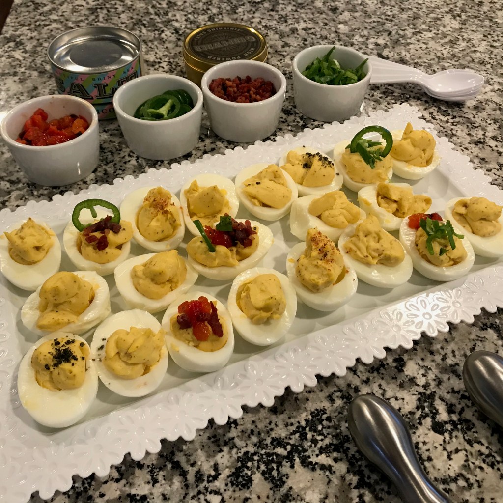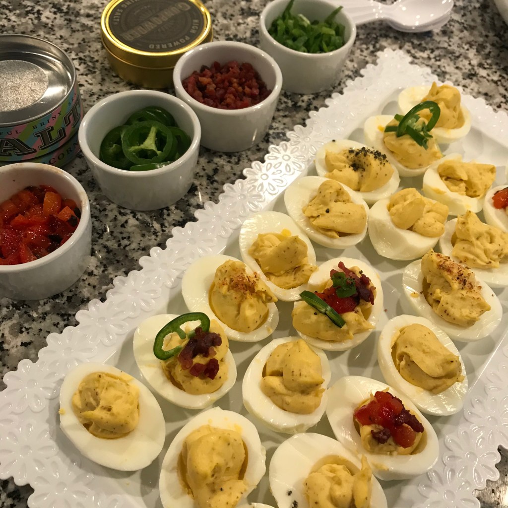 - For this I like to put all the toppings in small bowls with the tray of eggs and allow my guests to top their own. I top up a few "examples" with various combinations of the toppings and then each person can "top their own eggs".