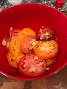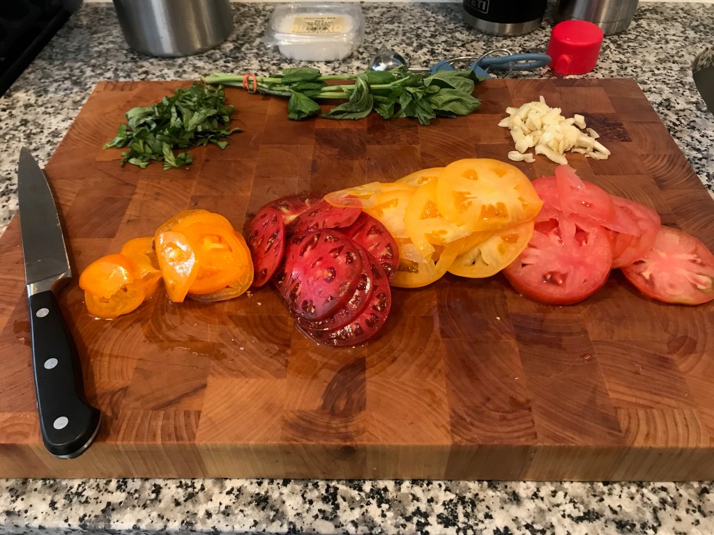 - 1 1/2 lbs heirloom tomatoes, sliced 1/4 inch thick